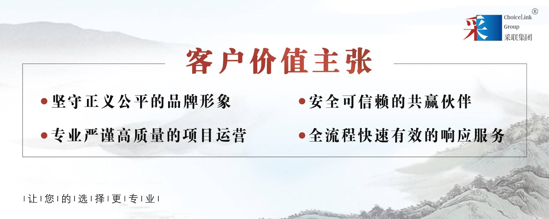 采聯(lián)集團(tuán)致力于為廣大客戶提供采購全流程專業(yè)服務(wù),堅守“守正出奇”的核心價值觀,以公平公正為原則,不斷優(yōu)化服務(wù)、堅持創(chuàng)新發(fā)展。依托多元化、專業(yè)化的服務(wù),不斷向“締造最具創(chuàng)新力的采購服務(wù)品牌,構(gòu)筑采購領(lǐng)域最專業(yè)的資源交互平臺”的遠(yuǎn)大愿景邁進(jìn)。